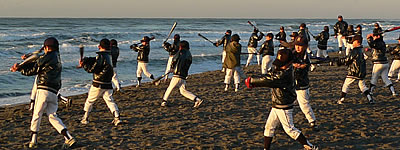 南御厨公民館から、福田の海岸までの約7Kmをみんなでマラソン!先頭を走るのは安間コーチ! 神明中学校野球部のみんなや、昨年卒団した中学生も参加! |