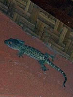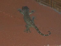 「トッケ」と呼ばれるヤモリです。「ゲッコー」と言うとわかる方も多いかと思いま す。 体調は20cmくらいはある、はっきり言って「でかい」。 鳴き声はよく耳にするのですが、かなり用心深いのでめったに姿をみることはできません。みかけてもトッケもびっくりするのかすぐ隠れ てしまいます。 が、ある日部屋の壁を見上げると、「??ねずみ?、が壁にくっついているわけがな いよなあ・・・」 というわけで、デジカメで撮ってみると・・・しっかりトッケちゃんでした! この日は、少しずつ移動しながらも何時間も姿をみせてくれました。